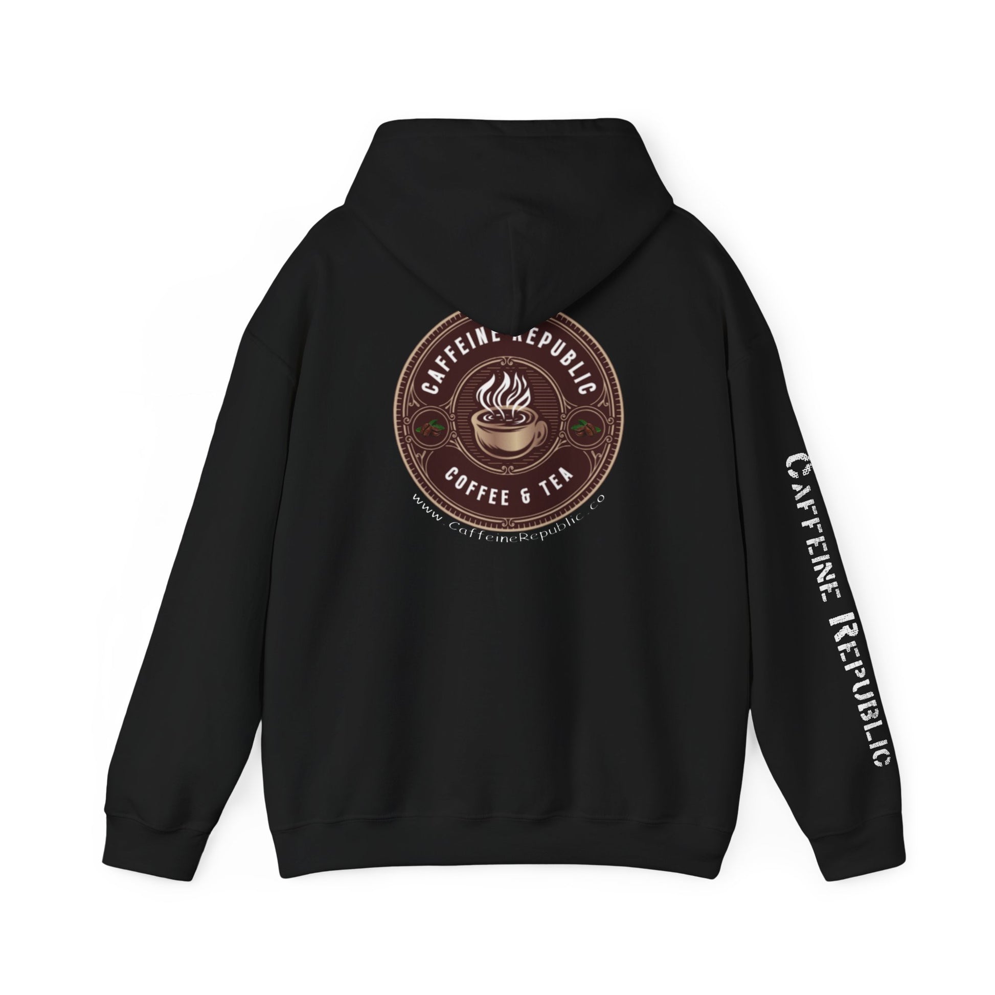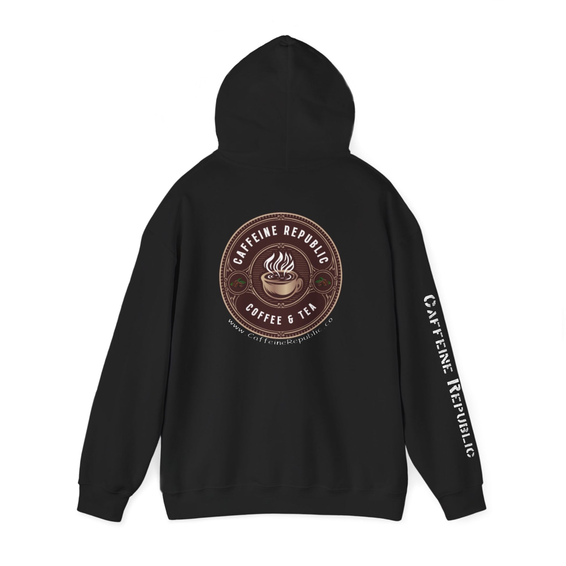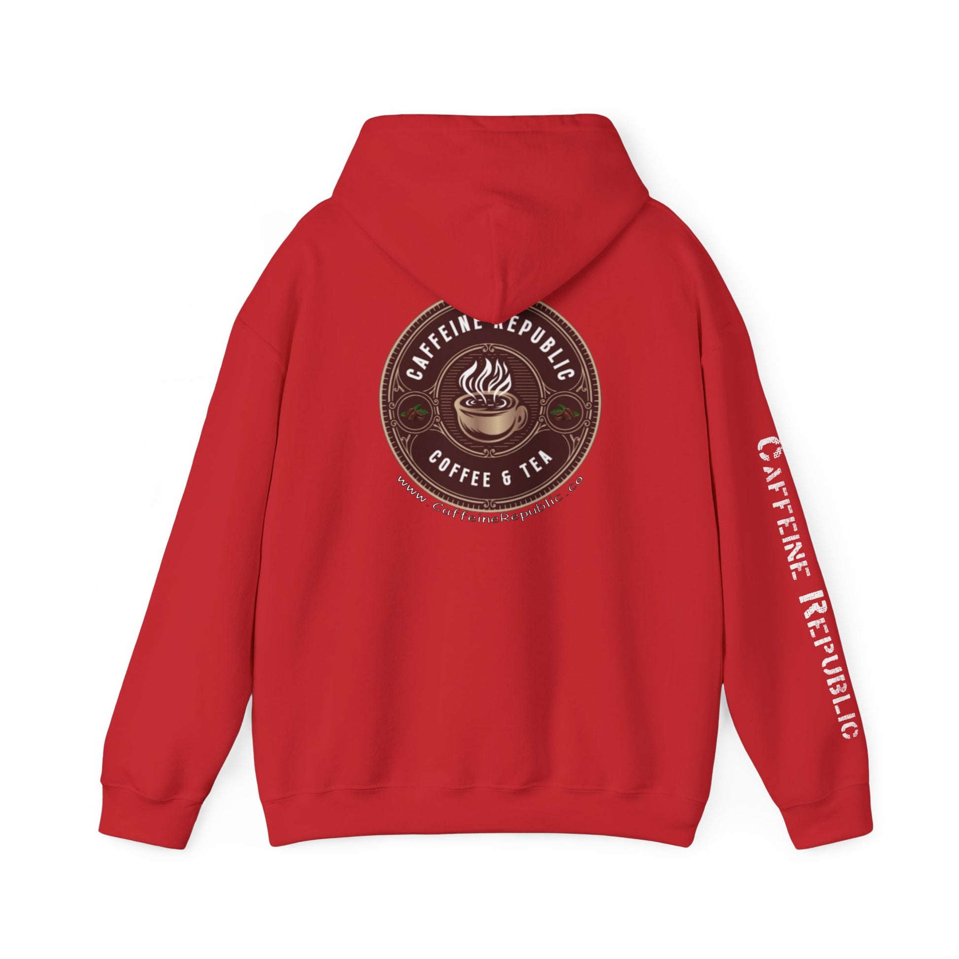 Stay cozy and stylish with this Caffeine Republic logo hoodie. Featuring bold lines and a warm design, this Hoodie is perfect for those who love to stay caffeinated. Ideal for adults looking for a cozy and fashionable option for chilly days. Perfect for coffee and/or lovers and those who appreciate a good caffeine fix. Great for casual wear, lounging at home, or running errands. Suitable for holidays like Christmas and casual celebrations.