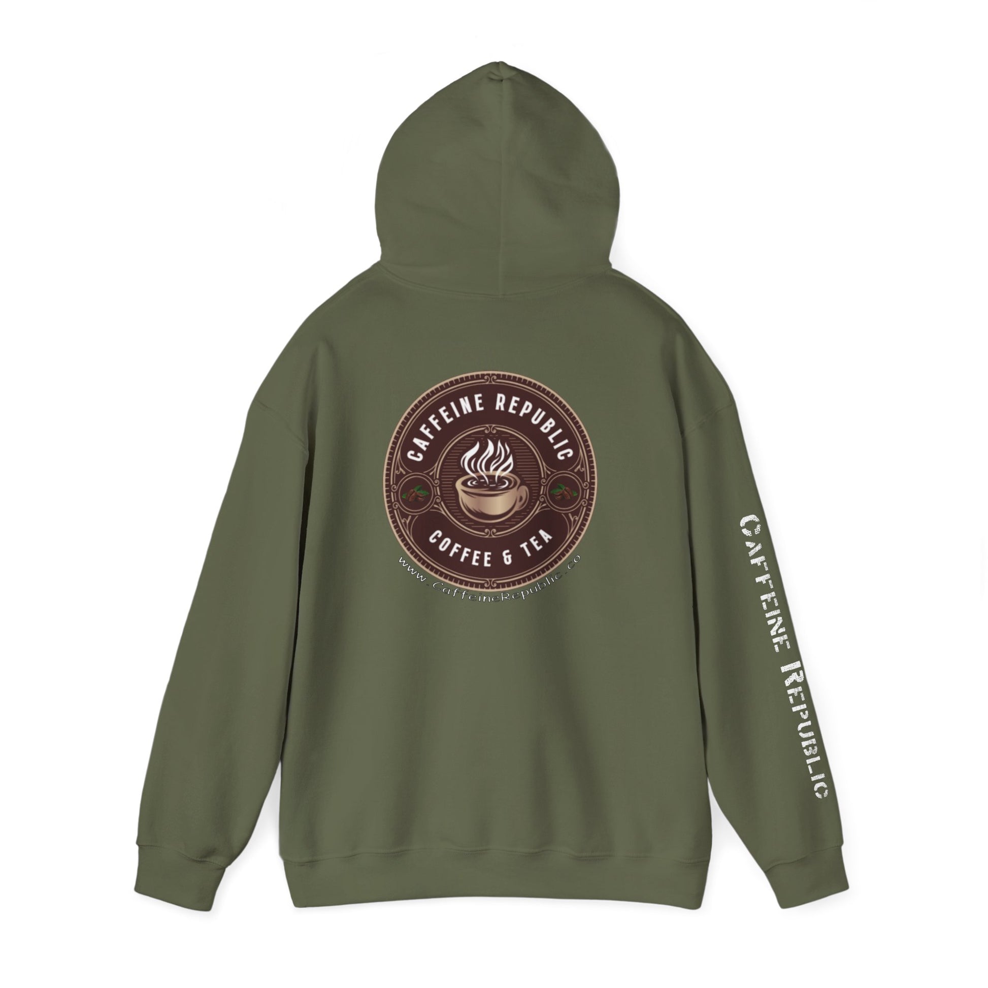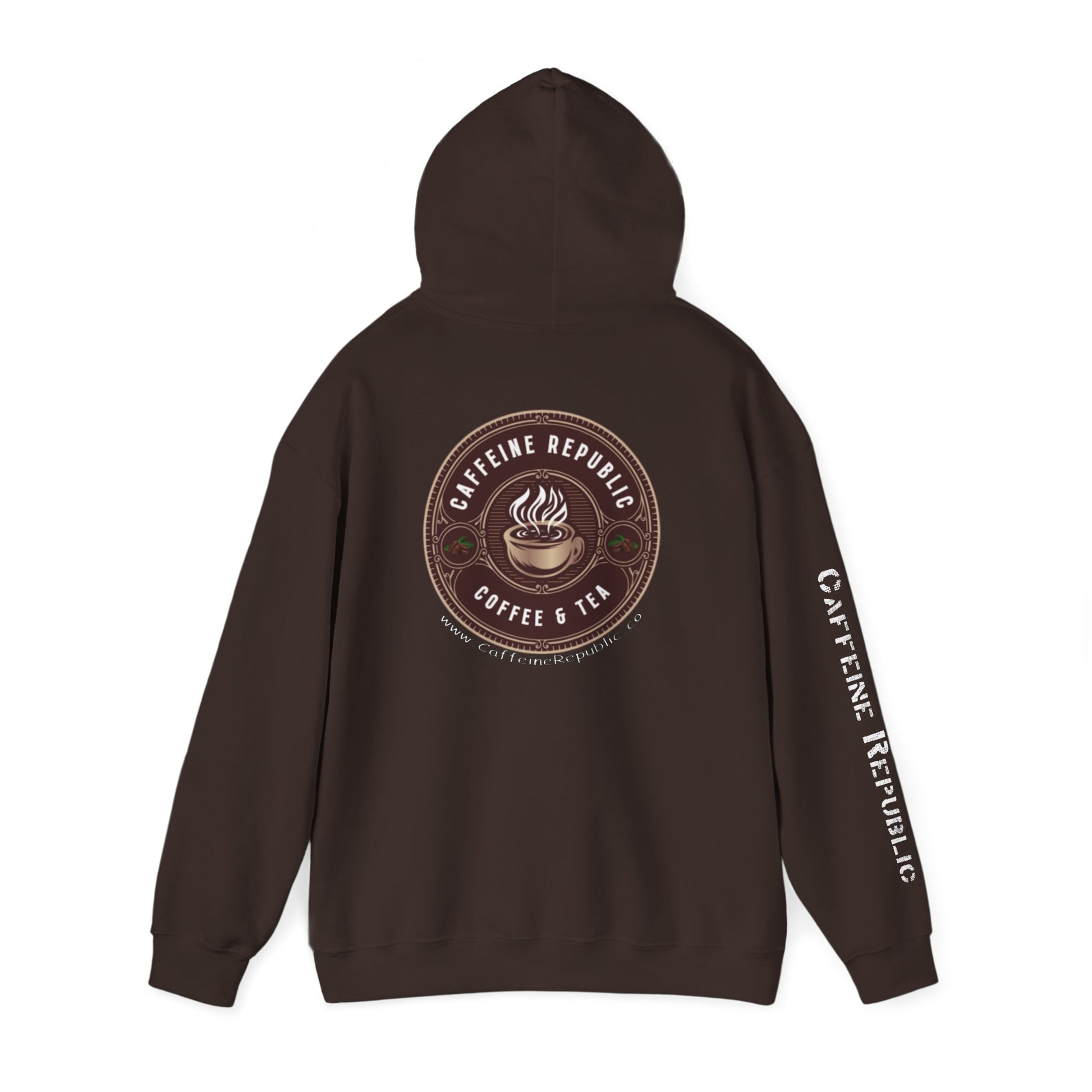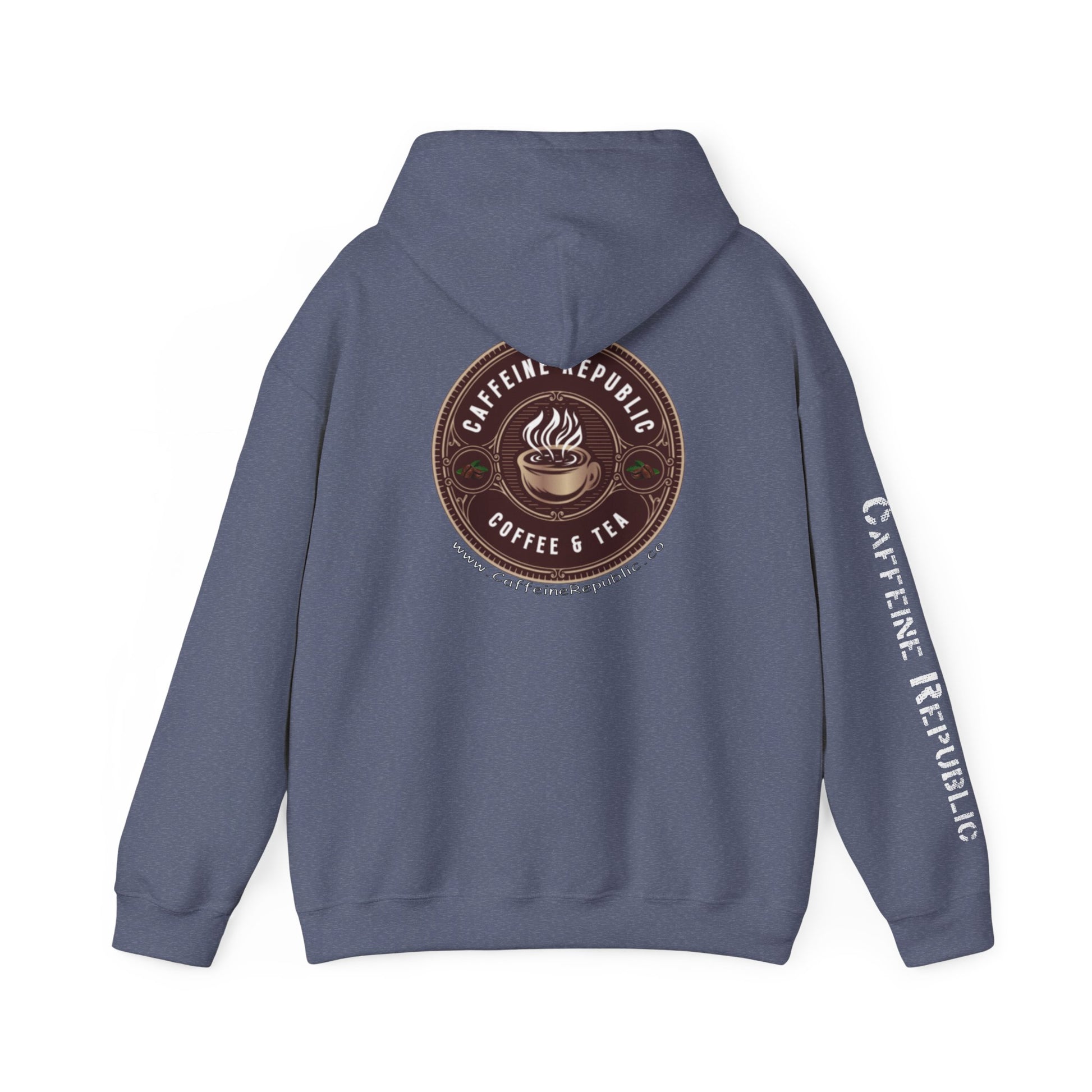 Stay cozy and stylish with this Caffeine Republic logo hoodie. Featuring bold lines and a warm design, this Hoodie is perfect for those who love to stay caffeinated. Ideal for adults looking for a cozy and fashionable option for chilly days. Perfect for coffee and/or lovers and those who appreciate a good caffeine fix. Great for casual wear, lounging at home, or running errands. Suitable for holidays like Christmas and casual celebrations.